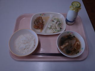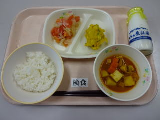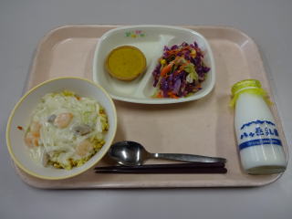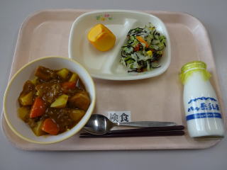 【お話給食A】 「うちにかえったガラコ」より,サフランライスカレー サフランスとターメリックライスの違い,もっと考えながら食べてみたかったです(カレーなので放送の時には既に食べ終わっている子が多数でした)。でも,ご飯に色がつくと本格的な感じになりますね。 ひじきサラダもさっぱりと美味しかったです。 ごちそうさまでした。 |
