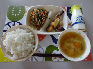 【お話給食C】 「ハロウィーンってなあに?」よりパンプキンタルト ハロウィーンメニューということで,子どもたちはとても楽しみにしていました。 ご飯もサラダもペロッとたいらげて,「タルト,おいしい」と嬉しそうにほおばっていました。いつも完食できない児童が全部美味しそうに食べていて,それも嬉しかったです。 ごちそうさまでした。 |
