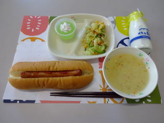 ホットドックは,具材が飛び出ることがないちょうどよいサイズと量で,子どもたちも食べやすかったのではないでしょうか。 コーンスープは,パンと相性バッチリでした。 メロンソーダゼリーも初めて食べました。ホイップもかわいくて美味しかったです。 ごちそうさまでした。 |