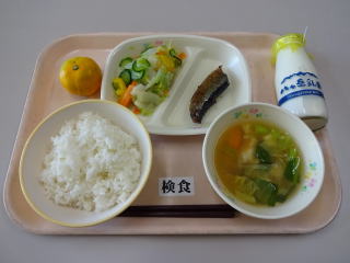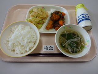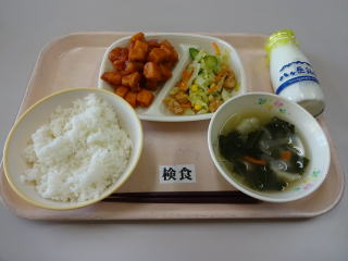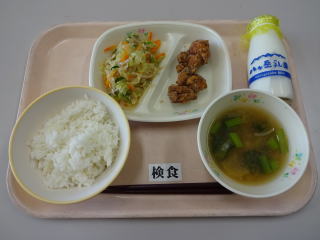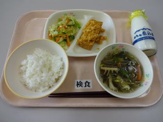 5年生は家庭科の味噌汁の学習に関連付けて「この出汁なんだろう」と言いながら,きのこと厚揚げの味噌汁を食べている子もいました。 黍魚子の唐揚げは,カレー風味が食欲をそそりました。 凍り豆腐のごま和えも,おかわり人気で,今日も完食でした。 ごちそうさまでした |