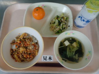 野沢菜そぼろ丼は,おかわりの声がたくさんありました。レシピを知りたい子がいたり,偏食の子が完食したり人気のメニューでした。 みかんも子どもたちは喜んでいました。 ごちそうさまでした。 |