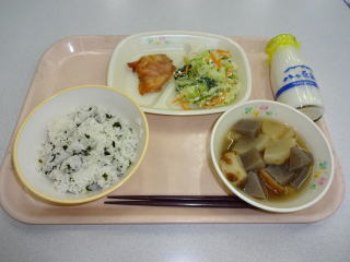 ちくわの味付けがおいすくて,「お父さんとお母さんにも食べさせてあげたい」と栄養士の先生に作り方を聞きに来た子もいましたね。 ゴボウサラダ,根菜の味噌汁も歯ごたえがよく,よく噛んで食べる習慣を培うよいメニューでした。 ごちそうさまでした。 |