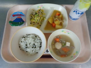 ごはん,汁,おかず,どれも食べ進みがよく,おかわりを希望する子が多かったです。 ふじさんゼリーはプッチンしてお皿に出して「ふじさんだ〜」と喜ぶ顔がいっぱいでした。ただまだシャーペット状でお腹が冷えてしまった子もいたようでした。 ごちそうさまでした。 |