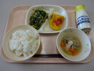白菜とのりのサラダは,のりの風味がよく,美味しかったです。 具だくさんオムレツやけんちん汁も,味がよく,また野菜もたくさん食べられて,素晴らしい献立だと思いました。 ごちそうさまでした。 |