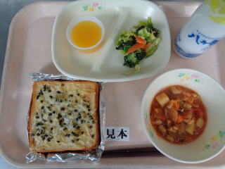 じゃこのりチーズトーストは,児童が給食前から楽しみにしている声が聞こえてきました。 ポークビーンズは色々な食べ物が入っていて,とても美味しかったです。パンとの相性もとてもよかったです。 ごちそうさまでした。 |